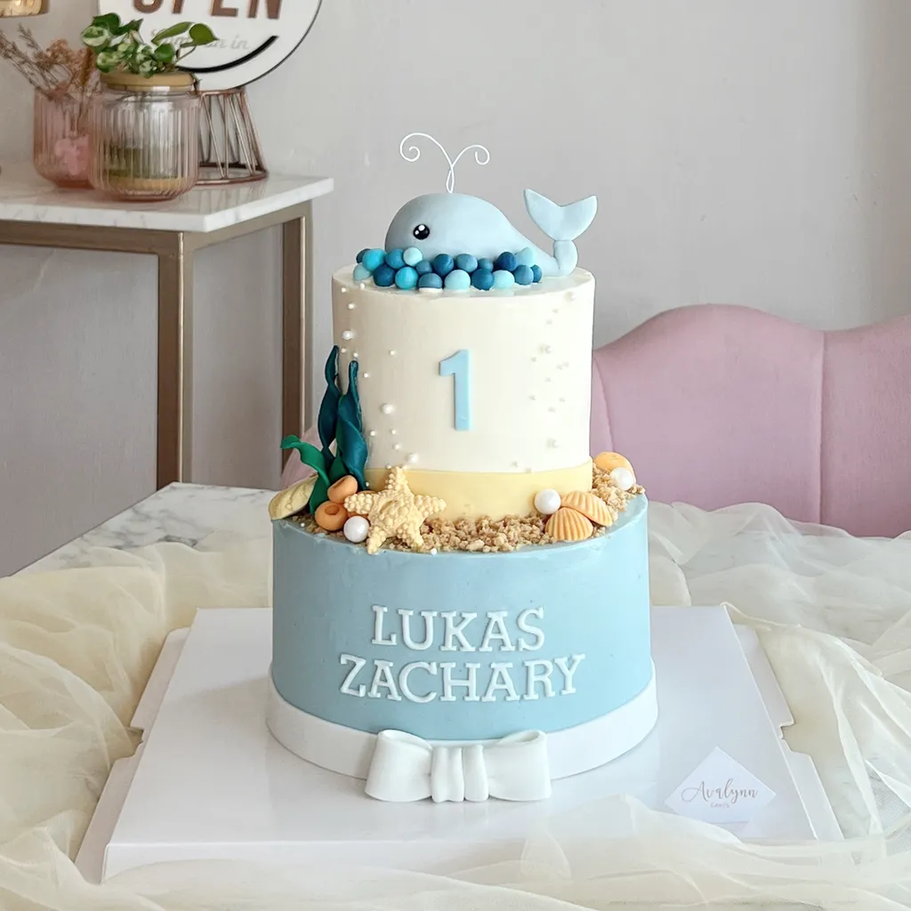 The Two-Tiered Oceanic Delight cake features two tiers of cake, frosted with vanilla buttercream. The cake's highlight is a playful fondant whale topper with intricate details. It's a stunning and delicious work of art that's perfect for any special occasion.