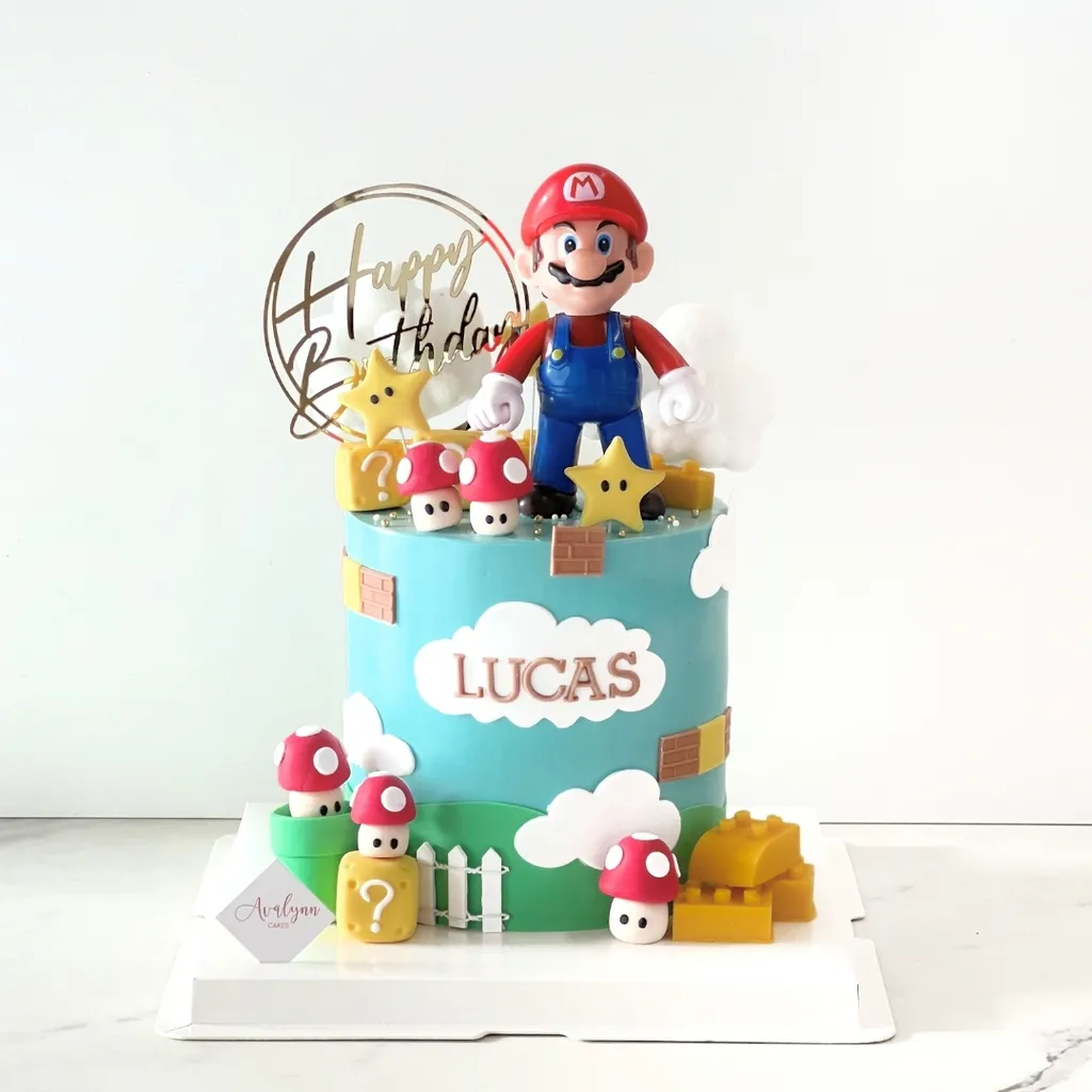 Experience Mario's iconic world with this Power-Up Cake, inspired by the beloved video game character. Decorated with vibrant colors and familiar symbols, it's perfect for any fan of classic gaming adventures.