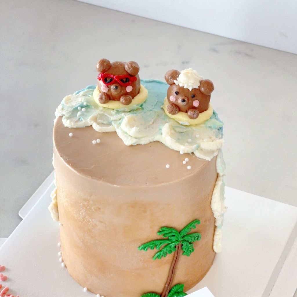 A charming cake featuring a cute teddy bear enjoying a sunny beach day, perfect for bringing a playful, beachy vibe to any celebration.