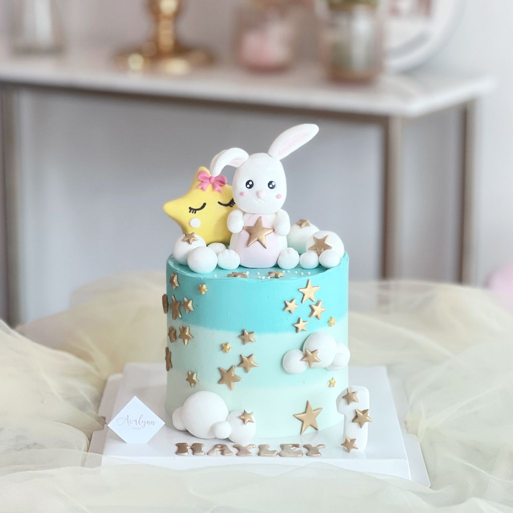 The Twinkle Bunny Cake is a delightful and whimsical dessert that will add a touch of magic to any occasion. This cake is filled with a light and creamy buttercream frosting, and it is beautifully decorated with a layer of pastel-colored frosting and adorned with fondant stars and a cute bunny figurine on top. The stars are dusted with edible glitter to give them a sparkling effect that makes the cake look like it's twinkling in the night sky. This cake is perfect for birthdays, baby showers, or any special event that calls for a touch of sweetness and enchantment.