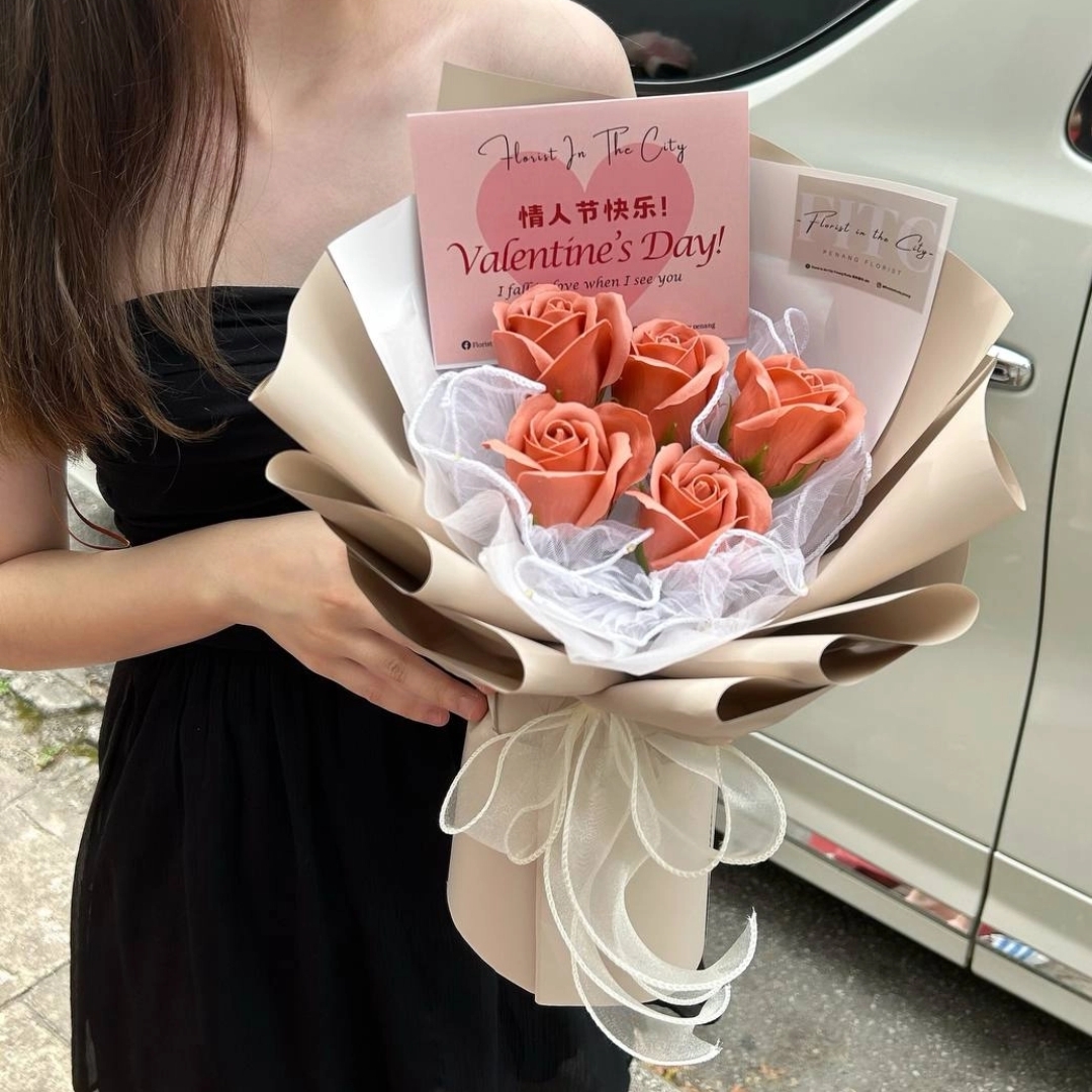 Feminine Lace 5 Cappuccino Roses Bouquet (Fresh/Soap)